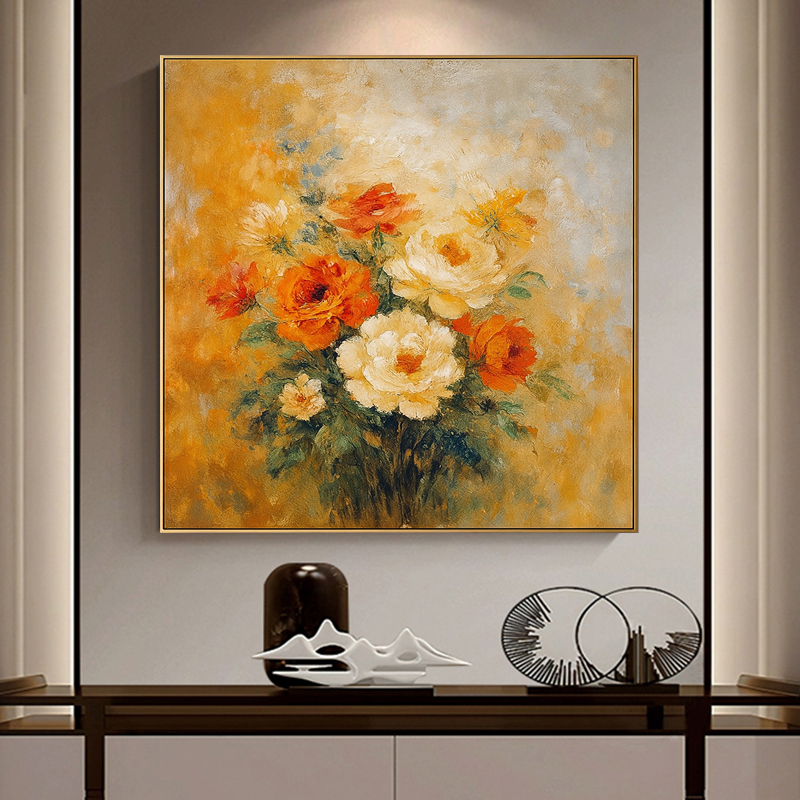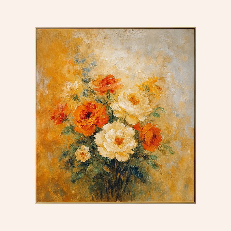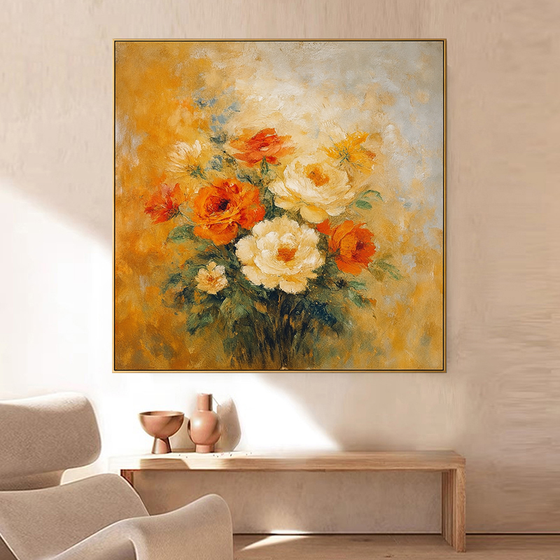 Bức tranh hoa hồng vàng-cam chất liệu cao cấp, phong cách bán ấn tượng, màu sắc bền đẹp, dễ phối hợp với nội thất hiện đại và cổ điển, phù hợp phòng khách, phòng ngủ hoặc quán cà phê.