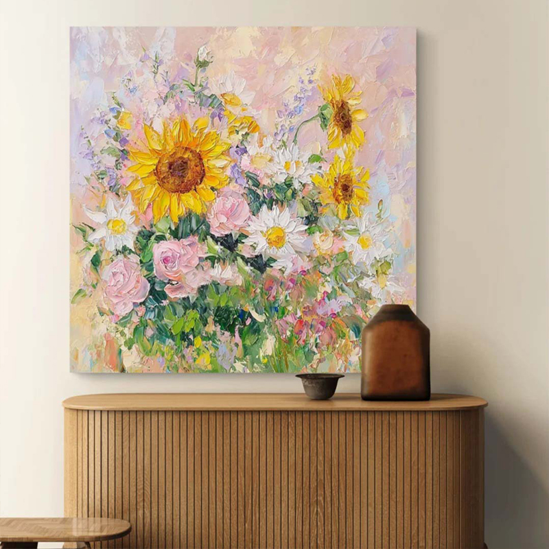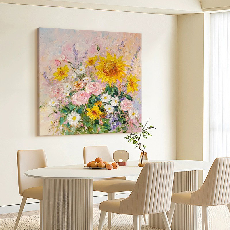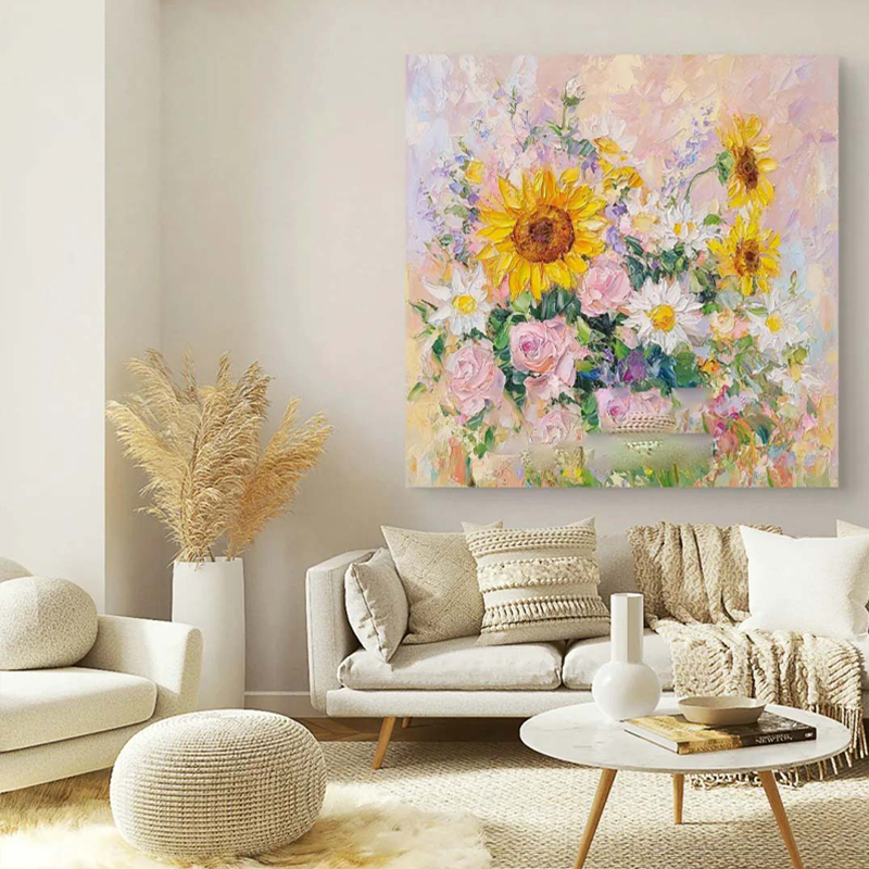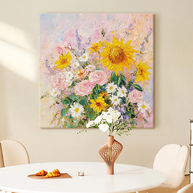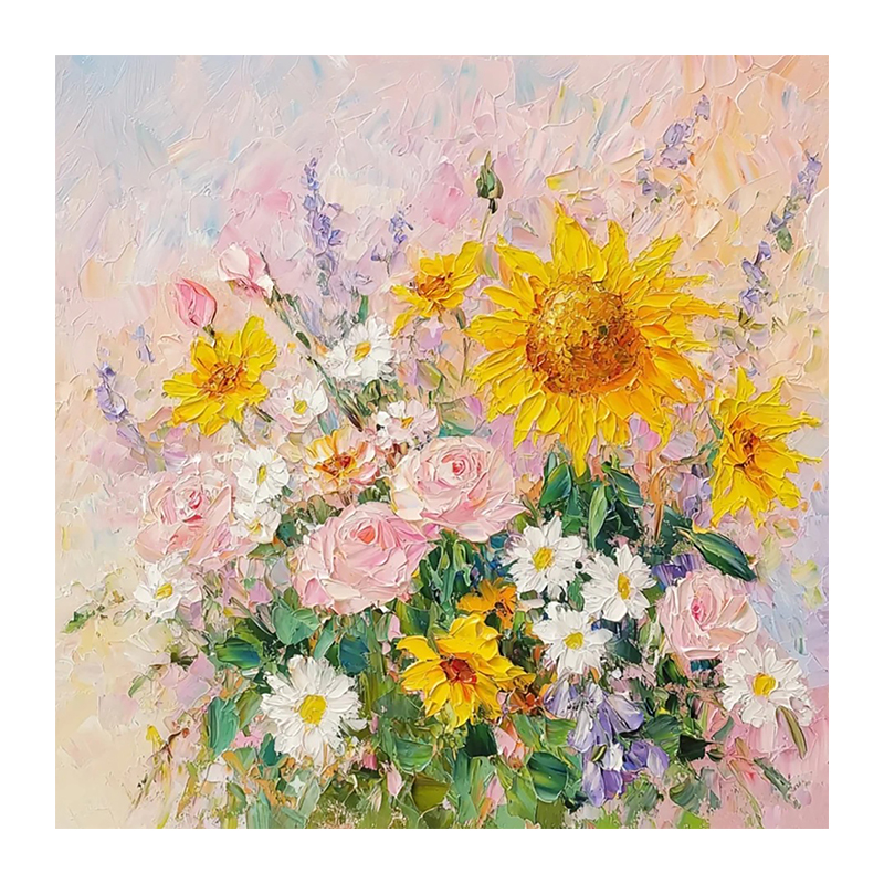 Tranh hoa hướng dương – hoa cúc – hoa hồng nghệ thuật 3D, mang đến không gian tươi sáng, sang trọng và đầy sức sống. Tác phẩm với gam màu pastel hài hòa, chất liệu sơn dầu cao cấp, phù hợp trang trí phòng khách, phòng ngủ và quán café.