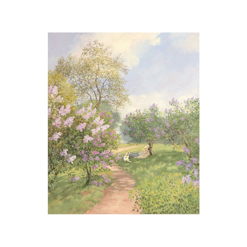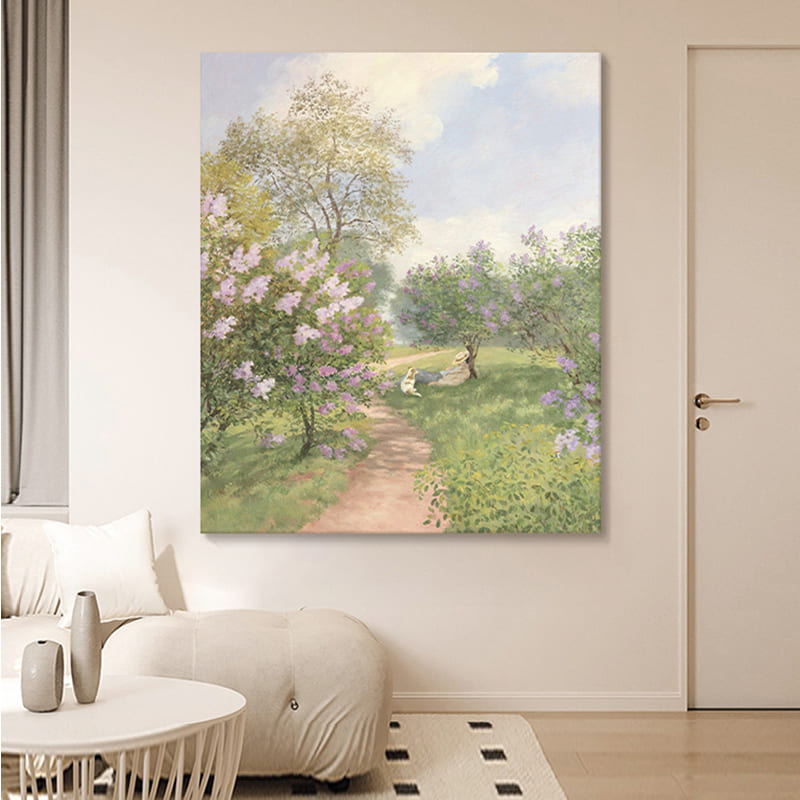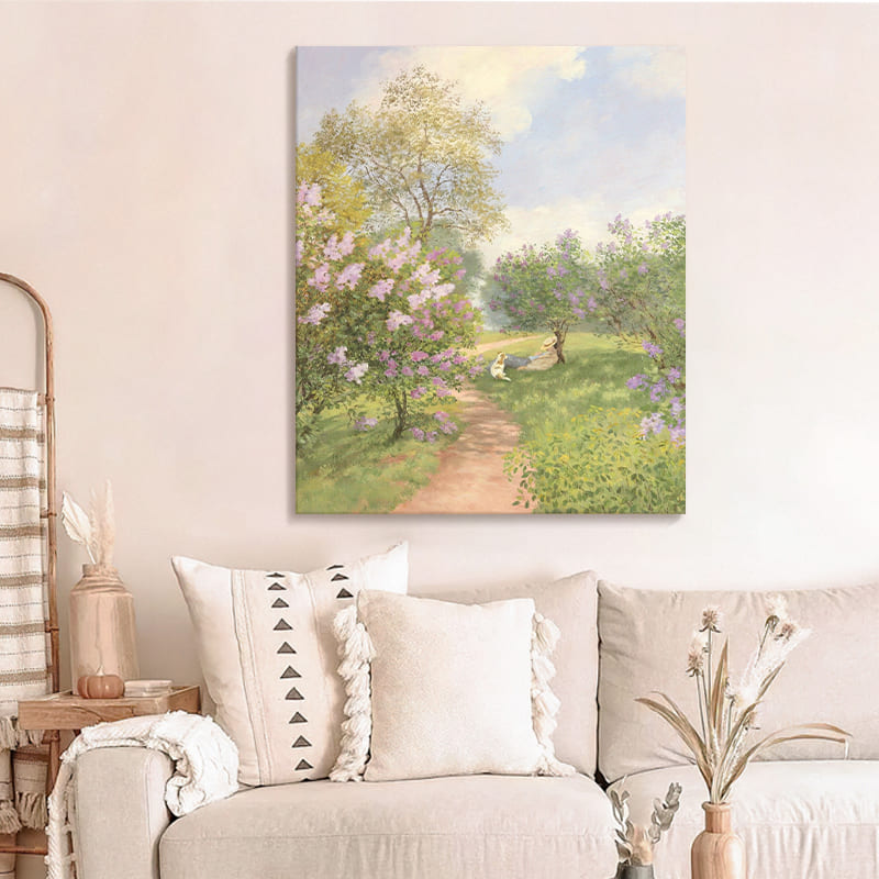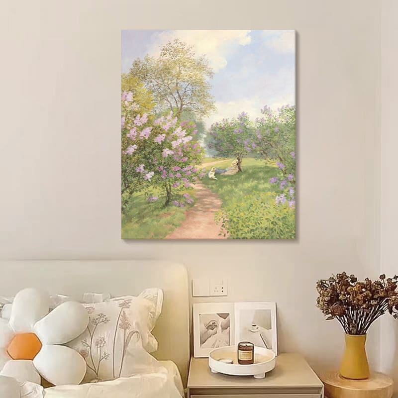Bức tranh phong cảnh thiên nhiên nhẹ nhàng, khắc họa con đường nhỏ uốn lượn giữa vườn cây xanh mát và những khóm hoa tím nở rộ. Ánh sáng dịu dàng chiếu qua tán lá, tạo nên không gian thanh bình, trong trẻo. Tranh mang phong cách lãng mạn, gợi nhớ đến những buổi chiều thảnh thơi nơi thôn quê. Phù hợp treo tại phòng khách, phòng ngủ hoặc không gian thư giãn, giúp mang lại cảm giác an yên và gần gũi với thiên nhiên.