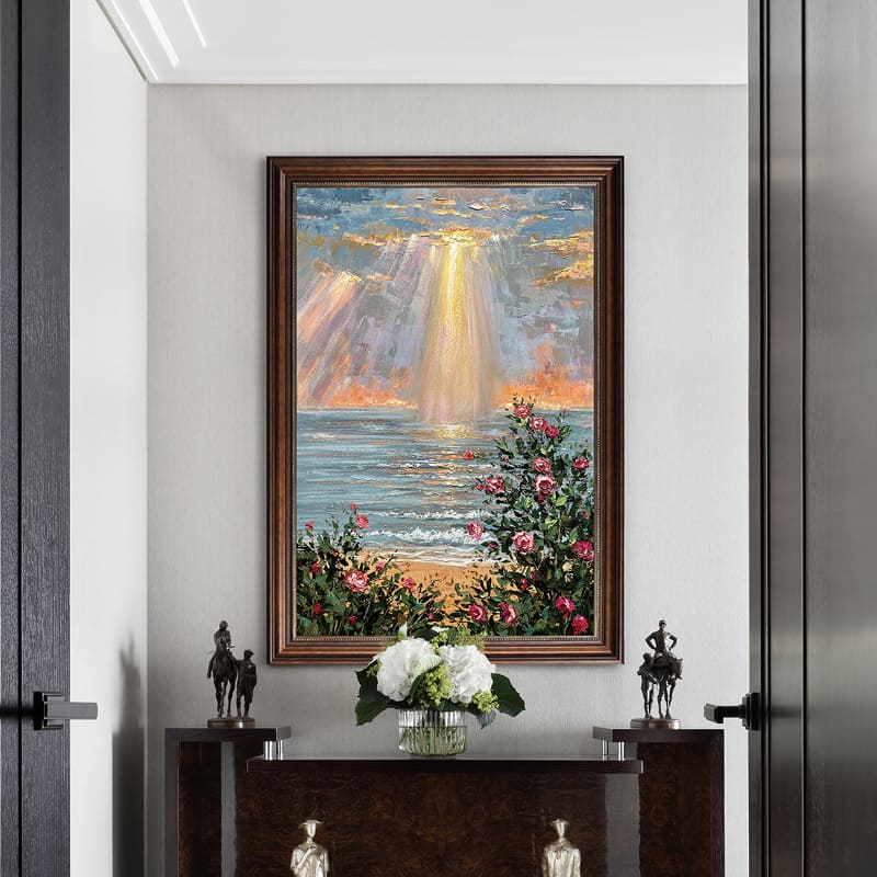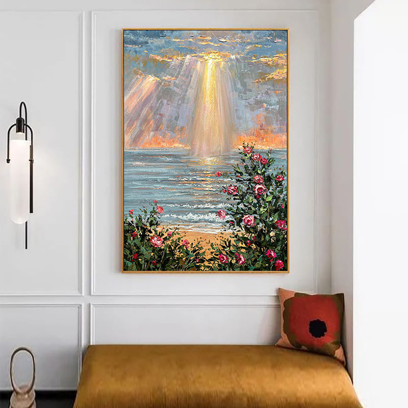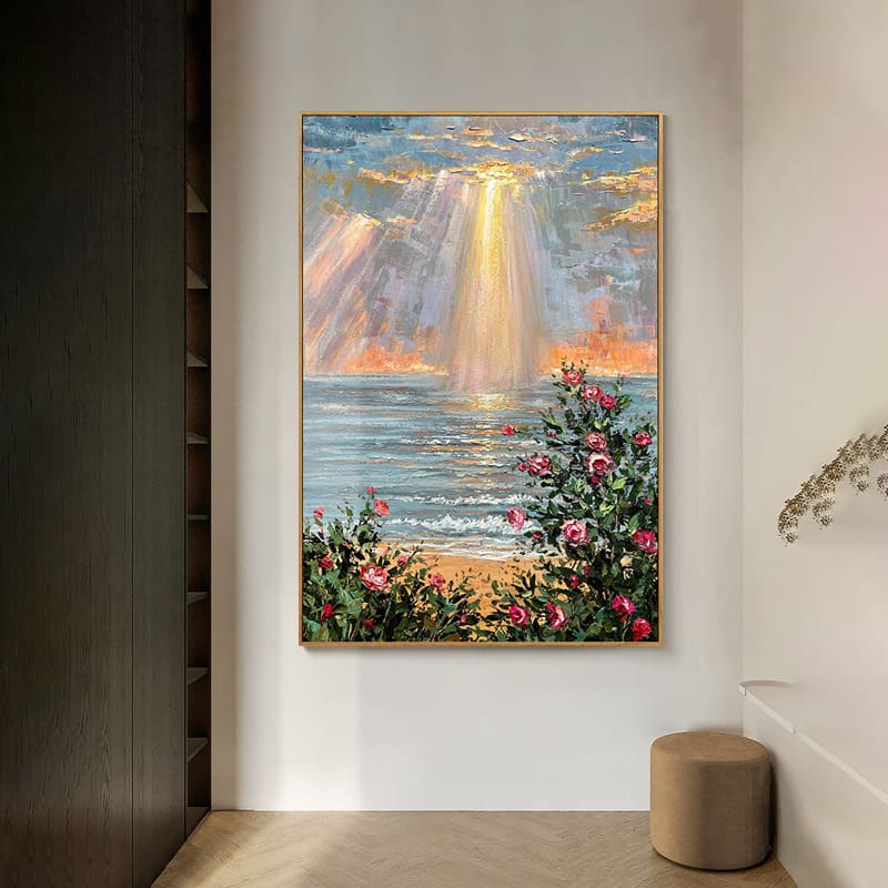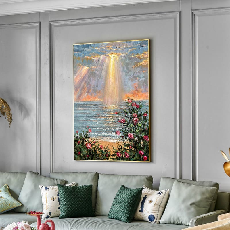 Bức tranh phong cảnh biển bình minh mang sắc màu rực rỡ, ánh sáng mặt trời xuyên qua mây phản chiếu lung linh trên mặt nước. Hàng hoa hồng ven bờ tạo điểm nhấn đầy lãng mạn, gợi cảm giác yên bình và tràn đầy hy vọng. Tranh thích hợp treo phòng khách, phòng ngủ hoặc không gian làm việc, đem lại năng lượng tích cực và tinh thần thư thái.