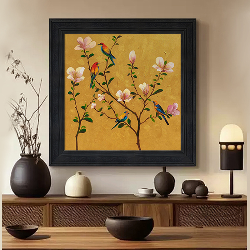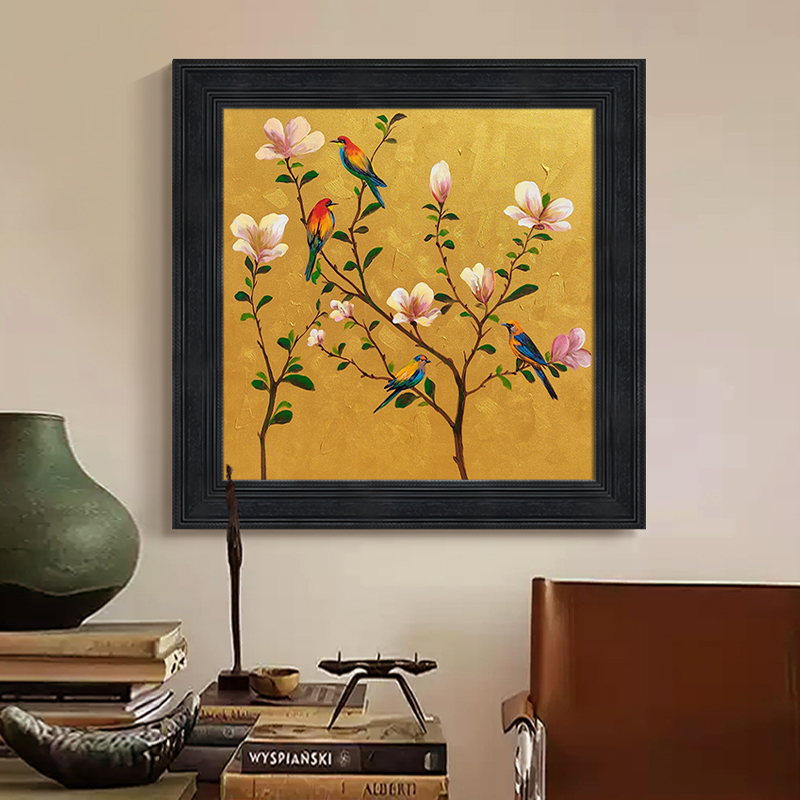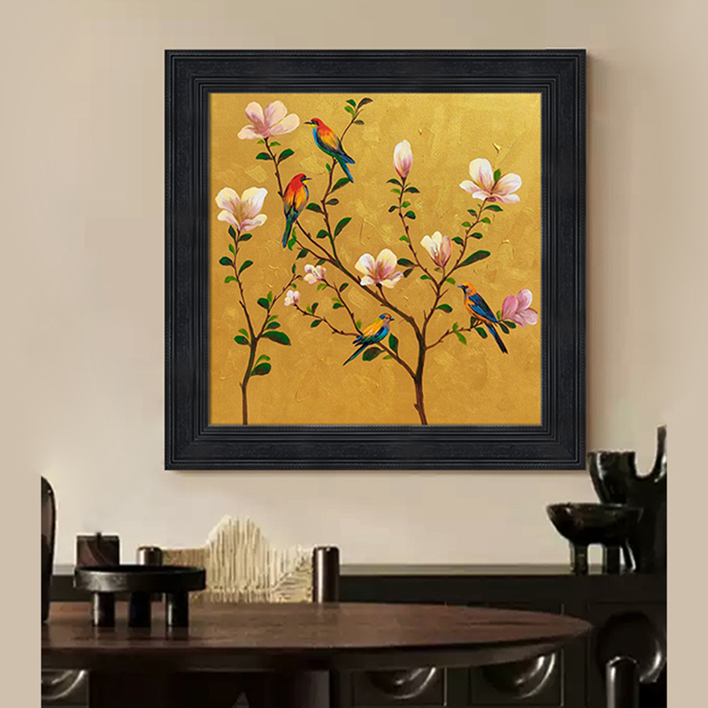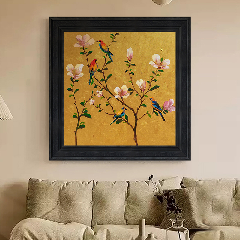 Bức tranh hoa mộc lan trên nền vàng cùng những chú chim sặc sỡ mang lại vẻ đẹp tươi mới, tràn đầy sức sống. Hình ảnh hài hòa giữa thiên nhiên và muông thú tạo cảm giác ấm áp, thư thái. Tranh phù hợp treo phòng khách, phòng ăn, phòng làm việc hay quán café, vừa sang trọng vừa gần gũi, giúp không gian trở nên sống động và cuốn hút.