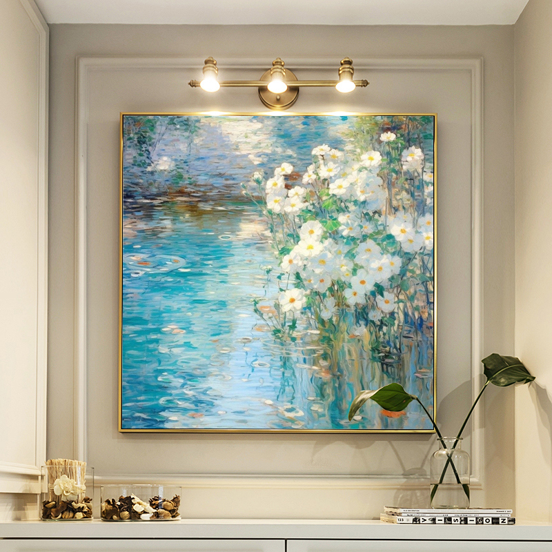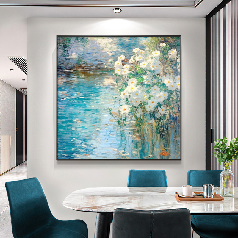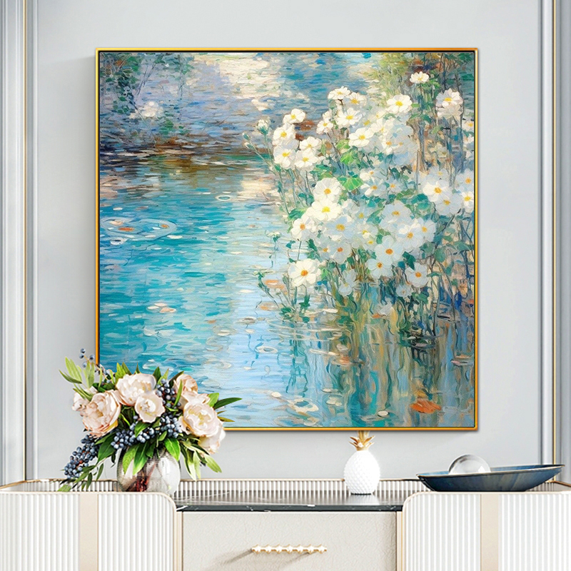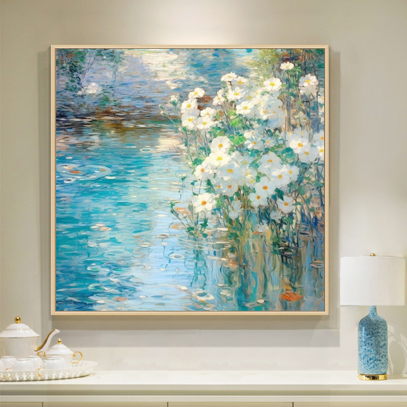 Bức tranh hoa trắng bên hồ nước xanh được vẽ theo phong cách ấn tượng, gợi lên sự yên bình và lãng mạn. Những bông hoa tinh khôi hòa cùng mặt hồ phản chiếu lung linh tạo nên không gian đầy chất thơ. Tác phẩm thích hợp treo tại phòng khách, phòng ăn hay văn phòng, giúp mang lại sự tươi mới, cân bằng và thanh thản cho gia chủ.