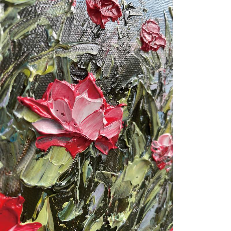 Bức tranh sơn dầu khắc họa khung cảnh biển lúc hoàng hôn, mặt trời dần khuất sau đường chân trời, ánh sáng vàng cam phản chiếu lung linh trên sóng nước. Hai bên lối đi là những khóm hoa hồng đỏ nở rộ, tạo nên bức tranh vừa lãng mạn vừa bình yên. Tác phẩm mang lại cảm giác thư thái, thích hợp treo phòng khách, phòng ngủ hoặc không gian nghỉ dưỡng, giúp tâm hồn thư giãn sau ngày dài.