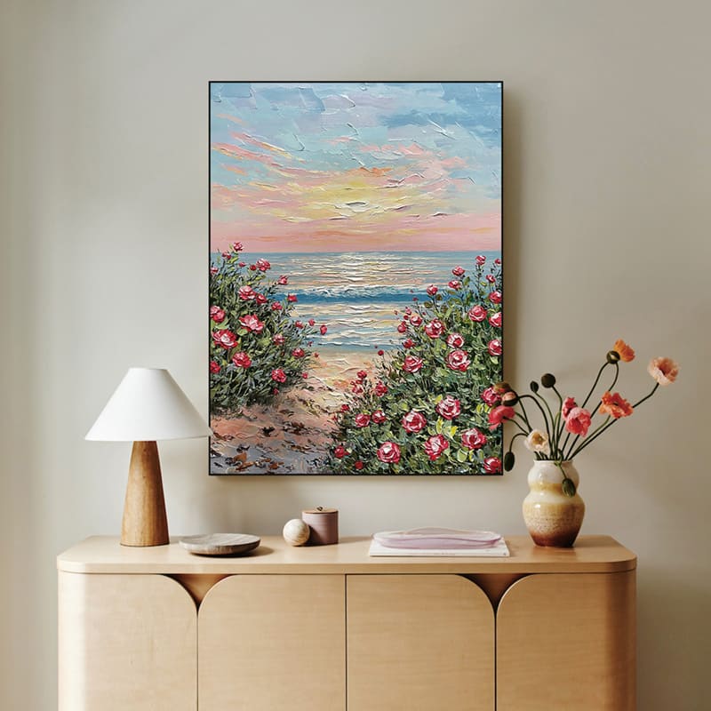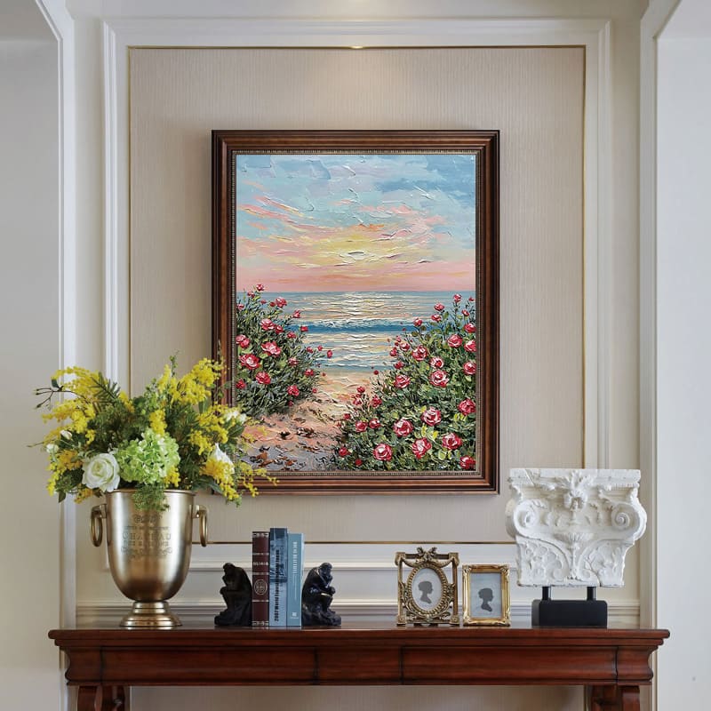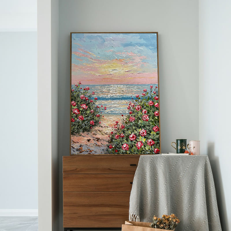 Tranh sơn dầu phong cảnh biển hoàng hôn, hoa hồng nở rực rỡ, mang vẻ đẹp lãng mạn và thư giãn.
