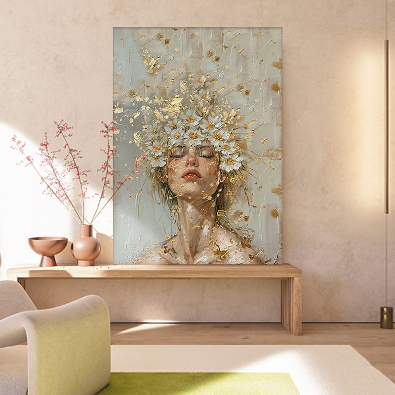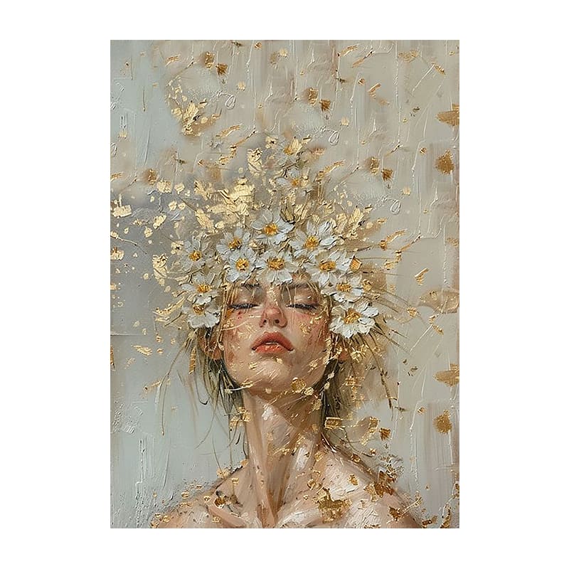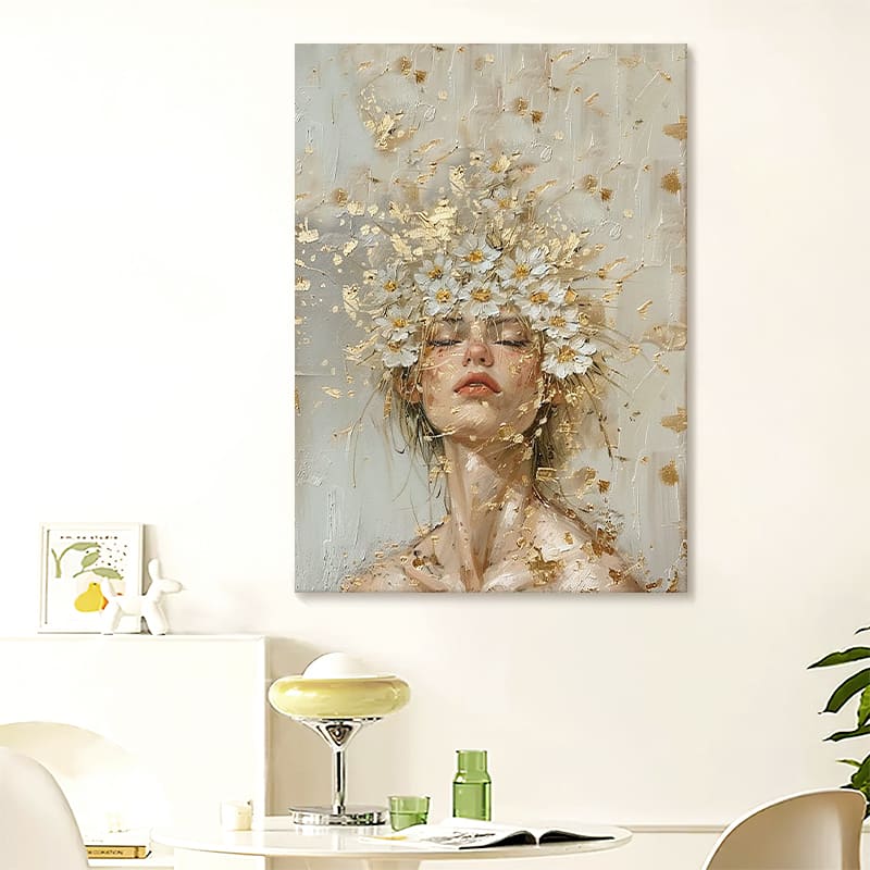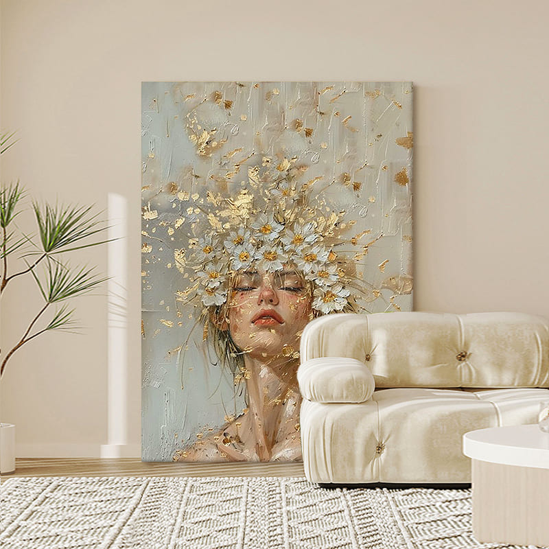 Bức tranh sơn dầu độc đáo khắc họa chân dung thiếu nữ với gương mặt thanh thoát, đôi mắt nhắm hờ, toát lên vẻ đẹp dịu dàng và mơ mộng. Điểm nhấn là vương miện hoa cúc trắng nở rộ, hòa quyện cùng gam vàng ánh kim tạo hiệu ứng lung linh, sang trọng. Tác phẩm vừa mang tính nghệ thuật, vừa đem lại cảm giác thư thái và lãng mạn, phù hợp treo phòng khách, phòng ngủ hay không gian nghệ thuật.